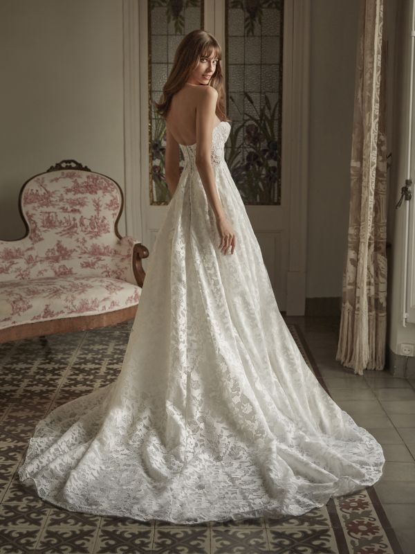 Questo abito in guipure con maniche rimovibili unisce il fascino dello scollo a cuore alla sensualità della schiena scoperta. Una silhouette principessa che si adatta a ogni momento della giornata.
